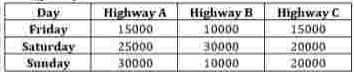 There are three highways i.e. Highways A, Highways B and Highways C, Some numbers of vehicles on these highways on different days i.e. Friday, Saturday and Sunday. On each day some numbers of vehicles pass on these three highways.