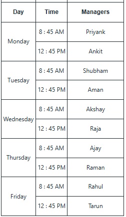 Ten Managers namely Raman, Ankit, Raja, Aman, Akshay, Ajay, Priyank, Rahul, Shubham and Tarun from a MNC have meeting on five different day starting from Monday to Friday of the same week but not necessarily in the same order. Managers have meeting at two different time slots 8 : 45 AM and 12 : 45 PM. Shubham has a meeting on Tuesday at 08 : 45 AM. The number of people who have meeting between Priyank and Aman is the same as the number of people who have the meeting between Raja and Rahul. Ankit has the meeting day immediately before Shubham. Shubham does not have meeting on any of the days before Priyank. There is one manager who has meeting at 08 : 45 AM immediately before Tarun. Rahul does not have meeting at 012 : 45 PM. Aman does not have meeting on any day after Akshay. Only three people have meeting between Priyank and Akshay. Neither Priyank nor Akshay has any meeting on Friday. Only 2 people have meeting between Ajay and Tarun. Ajay does not have any meeting on any of the day after Rahul.