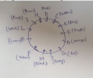 Immediate neighbours of K like the purple and golden colour but C doesn’t like purple colour. The one who likes blue is an immediate neighbour of C. Two people are sitting between the one who likes green colour and the one who likes brown colour. No one is sitting between F and the one who likes the black colour. Two people are sitting between A and C who don’t like the black colour. F likes yellow colour. Three people are sitting between E and the one who likes the black colour. A is sitting third to the right of the one who likes black colour. Two people are sitting between the one who likes pink colour and E who is sitting second to the left of C. One person is sitting between K and the one who likes the orange colour. Pink is not adjacent to black.The one who likes blue is sitting second to the left of D. L likes white colour and sitting second to the right of H. J likes grey colour and he is an immediate neighbour of G. H is an immediate neighbour of D. H is sitting third to the left of B who is sitting immediate left of the one who likes the yellow colour. G is sitting third to the right of F and likes the red colour. The one who likes green colour is sitting fourth to the left of G. I likes rust colour and sitting fourth to the left of M. The one who likes orange colour is sitting third to the right of M.