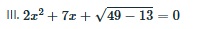 The equations are 1. ax2 + bx + 4 = 0 II. ax2 + 3x + c = 0 =2x2 + 7x+ √36 = 0 =>2x2+7x+6=0 Now, The product of roots of equation III is => The product of roots = c/a = 6/2 =3 : The required product of roots of equation III is 3.