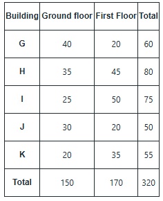 Building K: Total person living = 320 - (60 + 80 + 75 + 50) = 55 total person living on ground floor = 150 - (40 + 35 + 25 + 30) = 20 total person living in first floor = 55 - 20 = 35
