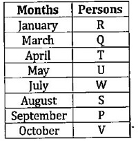Eight persons i.e. P, Q, R, S, T, U, V, W attend meeting in different months i.e. January, March, April, May, July, August, September, October in same year but not necessarily in same order. Three persons attend meeting between T and P who attend meeting in the month of 30 days. W attend meeting before V and after R. There are as many persons attend meeting before P as after Q. U attend meeting before S and after Q. S attend meeting before V and after W who doesn’t attend meeting in May.