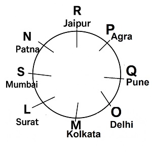R does not like Delhi. The one who likes Mumbai is an immediate neighbor of N. The one who likes Delhi sits to the immediate left of M. P and L are not adjacent to each other. R, who is not an immediate neighbor of N, sits second to the left of S, who likes Mumbai. P likes Agra and sits opposite to L. O is an immediate neighbor of L. N sits second to the left of L. Q likes Pune. M likes Kolkata and sits opposite to the one who likes Jaipur. L sits two places away from M. The one who likes Kolkata sit adjacent to the one who likes Patna. O likes Delhi.