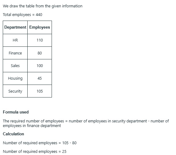 There are 5 departments in a company. There are total 110 employees in the HR department which is 25% of total employees in the company. 2 / 11 of the total employees of the company are working in Finance department. Employees work in sales is 25% more than that in Finance department. Ratio between working in Housing and security department is 3 : 7.