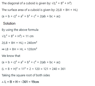 The length of a diagonal of a cuboid is 11 cm. The surface area is 240 square cm. What is the sum of its length breadth aod height ?